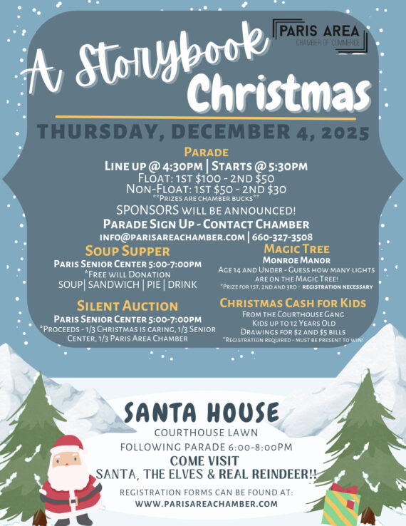 To register for the Christmas Cash for Kids drawing, fill out and submit the form below, or download a copy of the registration form, fill it out and email to info@parisareachamber.com